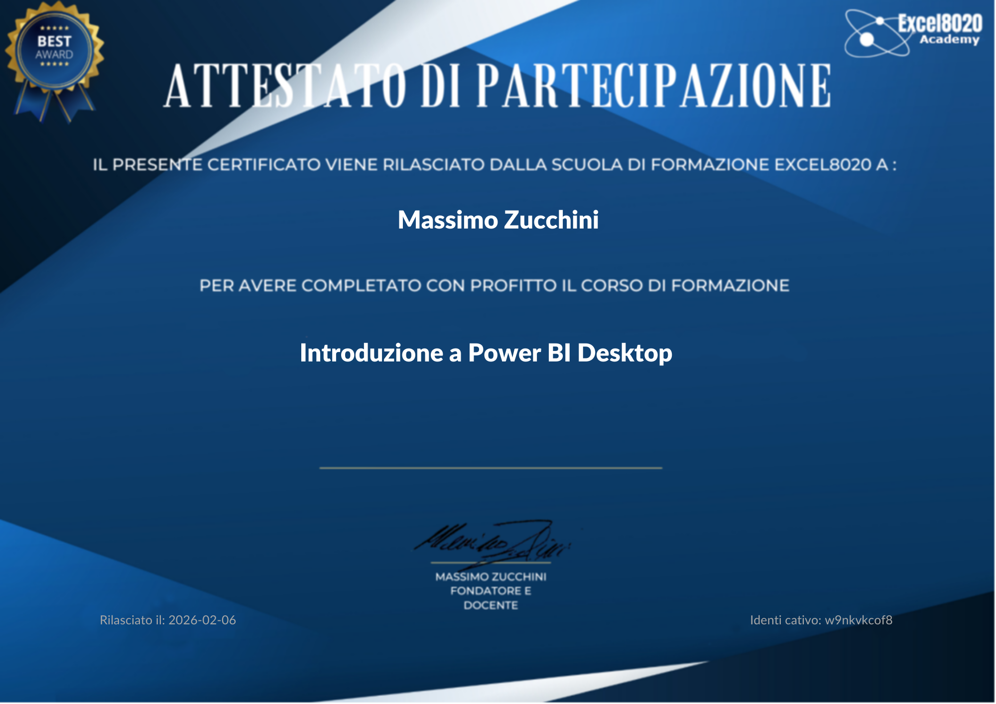 Ricorda che i corsi della Excel8020 Academy ( o comunque prodotti dal sottoscritto) sono seguiti da più di 300.000 persone, il tuo certificato vale.
