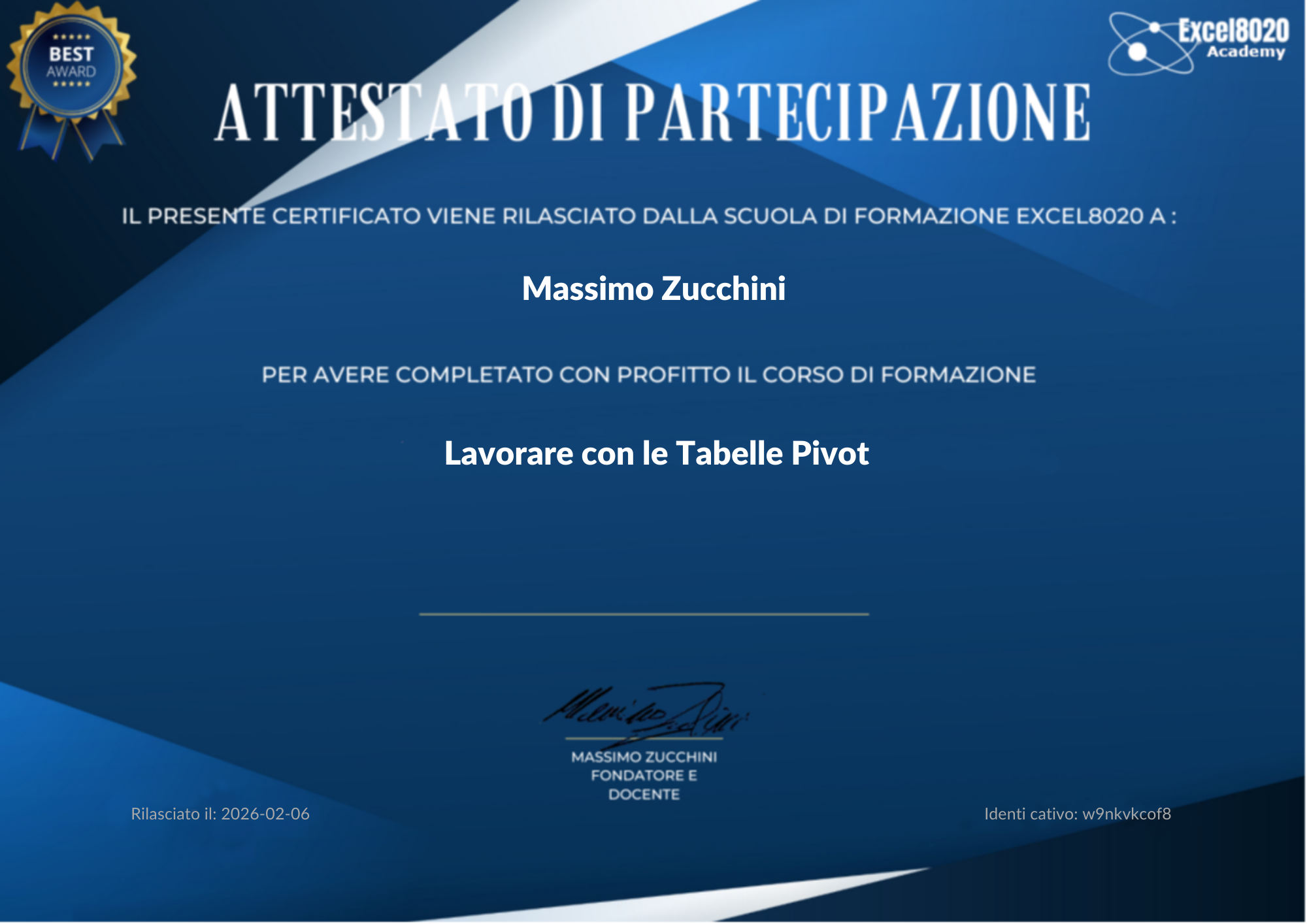 Il corso è considerato di breve durata: 2,5h ma dense di contenuti che ti porteranno immediatamente ad utilizzare professionalmente le tabelle Pivot